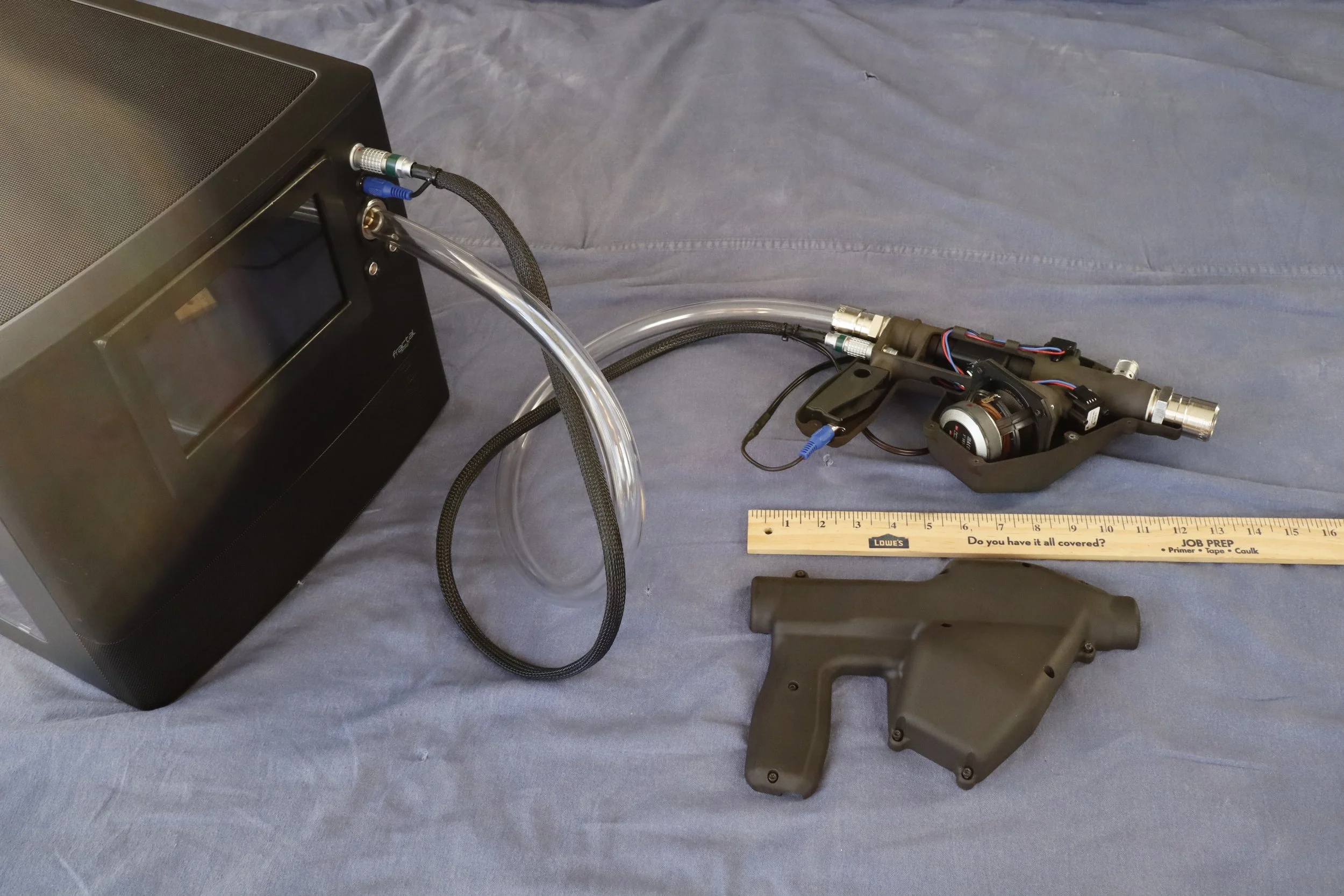 All surface modeling of the shells and internal component assembly design layout handled by Proto Dev and Fab. MJF additive manufacturing components with heat-set inserts were used to create the hand unit. Onboard sensors communicate data back through LEMO connectors to base unit for real-time control of operating parameters.