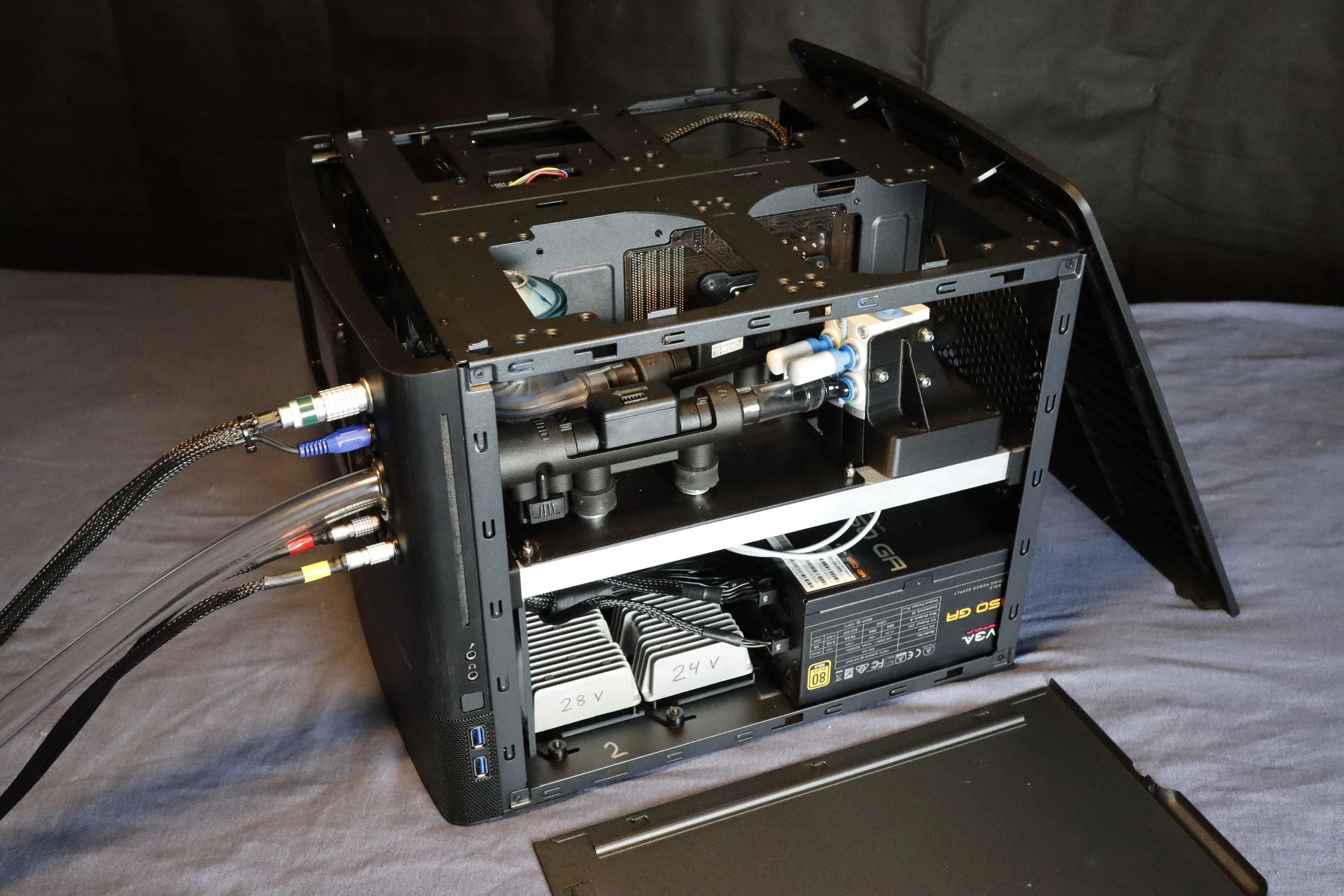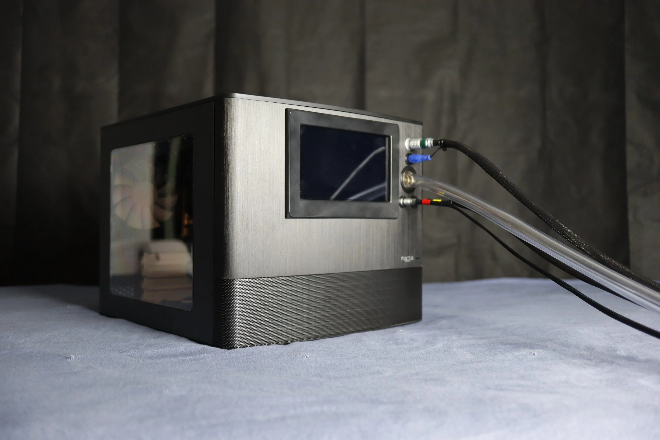 Touchscreen interface, signal processing, data logging, air flow management, and power distribution integrating into tight benchtop unit housed in a modified off-the-shelf PC case.